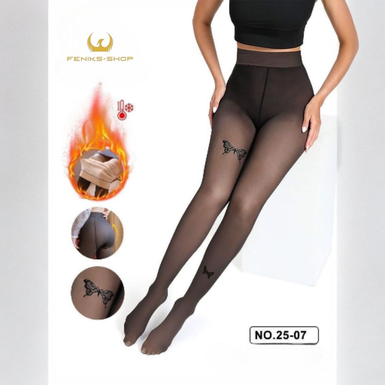 Diskretan motiv leptira daje ženstven i profinjen izgled, idealan za svakodnevne kombinacije, posao ili posebne prilike. Elastičan materijal savršeno se prilagođava tijelu, lijepo oblikuje noge i osigurava ugodno nošenje bez stezanja.